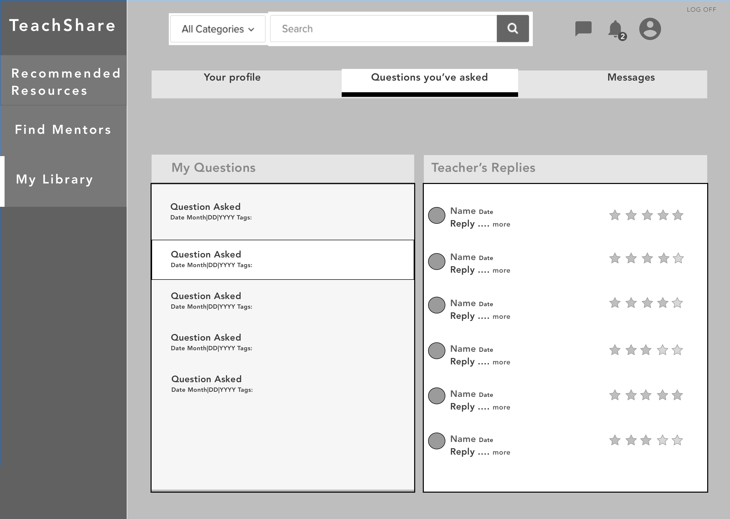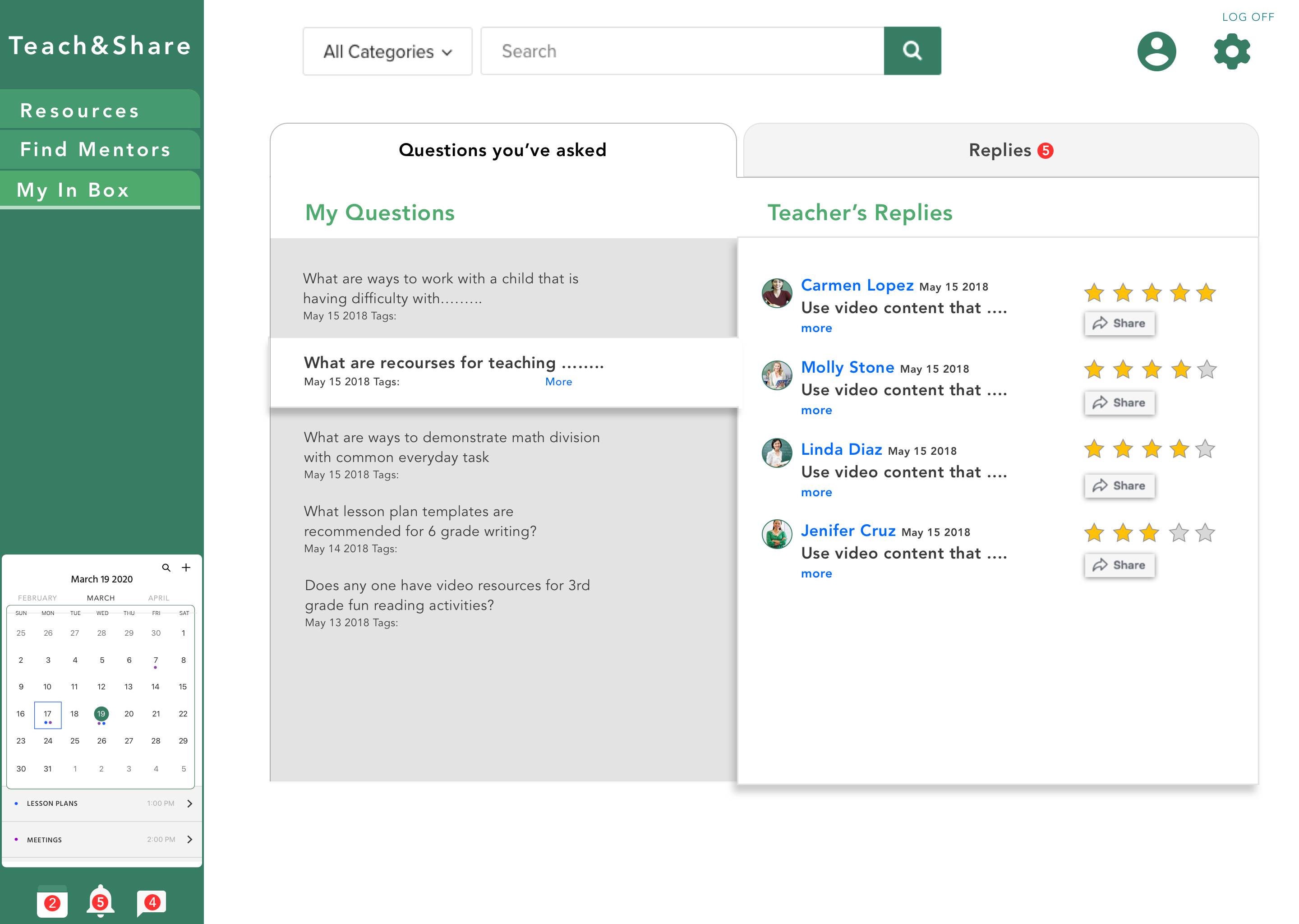 The Question Post page is where teachers can support each other by posting question that other teachers with experience can answer, provide resource such as links and upload material such as lesson plans, presentations, tests, quizzes, study material and media. Each question has it's own section for answers so that it is easier for the teacher to find content. Also the answers can be ranked and the ranking helps with the AI determine suitable mentors.
